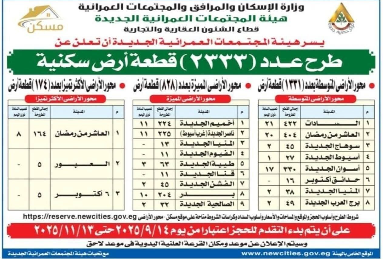 📅 موعد بدء الحجز الإلكتروني: 14 سبتمبر 2025 عبر موقع هيئة المجتمعات العمرانية